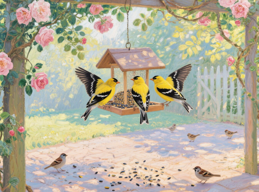 In summary, bird feeders in American gardens provide humans with a platform for close-up, continuous observation of birds. Through detailed observation and analysis of birds' foraging preferences, interspecific relationships, social hierarchies, group behavior, and family units around feeders, we can gain a deeper understanding of birds' complex ecological structures and diverse social organizations, thereby better appreciating these creatures that share our garden spaces.