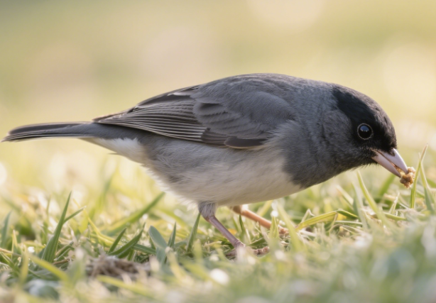 Physical characteristics: A small bird with mostly dark gray or brown feathers, a lighter-colored abdomen, and black eyes.