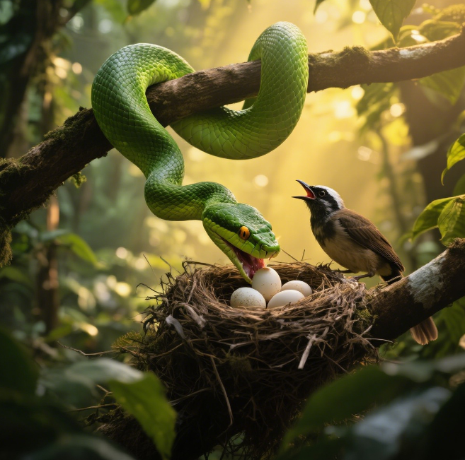 In addition to these common predators, reptilian snakes also pose a threat to birds. Arboreal snakes such as green tree pythons and king snakes are able to silently climb trees and sneak into nests to devour eggs and young. In the tropical rainforests of Central and South America, some snakes can even mimic the odor of bird eggs to attract their parents to hunt them. Bullfrogs, an invasive species of amphibians, have a prodigious appetite and prey on a variety of small birds and chicks, posing a threat to the survival of local birds.